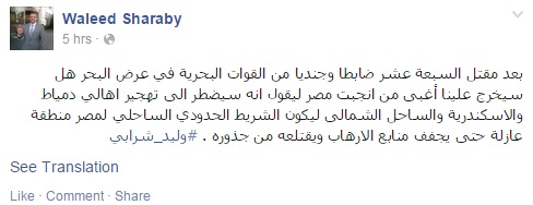وقال شرابي في تدوينة عبر صفحته على موقع التواصل الاجتماعي "فيس بوك": "بعد مقتل السبعة عشر ضابطًا وجنديًا من القوات البحرية، في عرض البحر، هل سيخرج علينا أغبى من أنجبت مصر، ليقول إنه سيضطر إلى تهجير أهالي دمياط، والإسكندرية، والساحل الشمالي، ليكون الشريط الحدودي الساحلي لمصر منطقة عازلة، حتى يجفف منابع الإرهاب، ويقتلعه من جذوره؟".