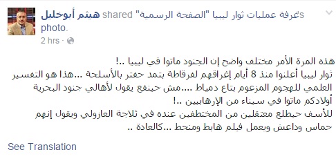 وأشار الناشط الحقوقي، أن "هذه المرة الأمر مختلف واضح إن الجنود ماتوا في ليبيا"، مضيفًا: "ثوار ليبيا أعلنوا منذ 8 أيام إغراقهم لفرقاطة بتمد حفتر بالأسلحة، هذا هو التفسير العلمي للهجوم المزعوم بتاع دمياط، مش حينفع يقول لأهالي جنود البحرية أولادكم ماتوا في سيناء من الإرهابيين، لافتًا "للأسف حيطلع معتقلين من المختطفين عنده في ثلاجة العازولي، ويقول إنهم حماس وداعش ويعمل فيلم هابط ومنحط كالعادة".