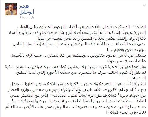 أكد الناشط الحقوقي هيثم أبو خليل، أن بيان المتحدث العسكري حول حادث الهجوم على أفراد من القوات البحرية فى البحر المتوسط، "مبتور".