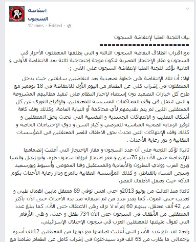 وتابع البيان: "لقد بلغ عدد الأسر التي أعلنت تضامنها مع ذويها من المعتقلين 12 ألف أسرة، بإجمالي ما يقارب من 65 ألف فرد سيدخلون في إضراب كامل عن الطعام، تضامنًا مع انتفاضة السجون الثالثة في بدايتها، وهو ما لم يحدث من قبل، كما قام أكثر من 5 آلاف ناشط على الانترنت بإعلان تضامنهم مع الانتفاضة بتسجيل "سيلفي الحرية" ونشره على الصفحات والمواقع المختلفة".
