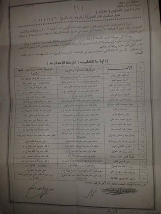 وبناءًا على موافقة السيد الأستاذ / وكيل وزارة التربية والتعليم بتشكيل لجنة برئاسة السيد / وكيل المديرين تشرف على ما تم بمعرفه السادة / مديري الإدارات التعليمية ويختصون بتمكين المرشحين الحاصلين على أعلى الدرجات ووفقًا لرغباتهم، يتم تسكين كل من السادة الآتي وظائفهم بعد في الوظائف الواضحة قرين كل اسم منهم لمدة عامين قابلة للتجديد.