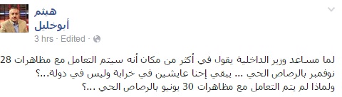 وقال أبو خليل في تدوينة عبر صفحته على موقع التواصل الاجتماعي "فيس بوك": "لما مساعد وزير الداخلية يقول في أكثر من مكان، أنه سيتم التعامل مع مظاهرات 28 نوفمبر بالرصاص الحي، يبقى إحنا عايشين في خرابة، وليس في دولة".