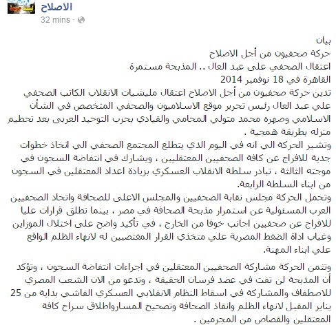 أدانت حركة صحفيون من أجل الإصلاح اعتقال قوات الانقلاب الكاتب الصحفي علي عبد العال رئيس تحرير موقع الإسلاميون، والصحفي المتخصص في الشأن الإسلامي، وصهره محمد متولي المحامي والقيادي بحزب التوحيد العربي بعد تحطيم منزله بطريقة همجية .
