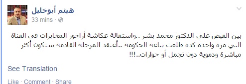 وقال أبو خليل في تدوينة عبر صفحته على موقع التواصل الاجتماعي "فيس بوك": "بين القبض على الدكتور محمد بشر.. واستقالة عكاشة أراجوز المخابرات في القناة، التي مرة واحدة كده طلعت بتاعة الحكومة.. أعتقد المرحلة القادمة ستكون أكثر مباشرة ودموية دون تجمل أو حوارات!".