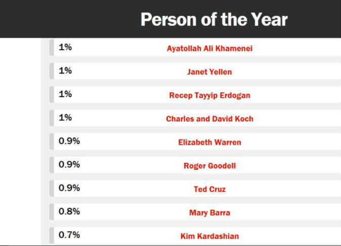 وتراجع الرئيس الأمريكي، باراك أوباما، 9 مراكز، محتلًا المركز الـ23 بنسبة 1.7%، بينما جاء في المرتبة الـ22 أمير تنظيم داعش ، أبوبكر البغدادي، حيث حصل على 1.7%، بينما حلت في المرتبة الـ47 نجمة تليفزيون الواقع، كيم كارداشيان بنسبة 0.7% من أصوات قراء «تايم»، وفقاً لما نقلته صحيفة المصري اليوم.