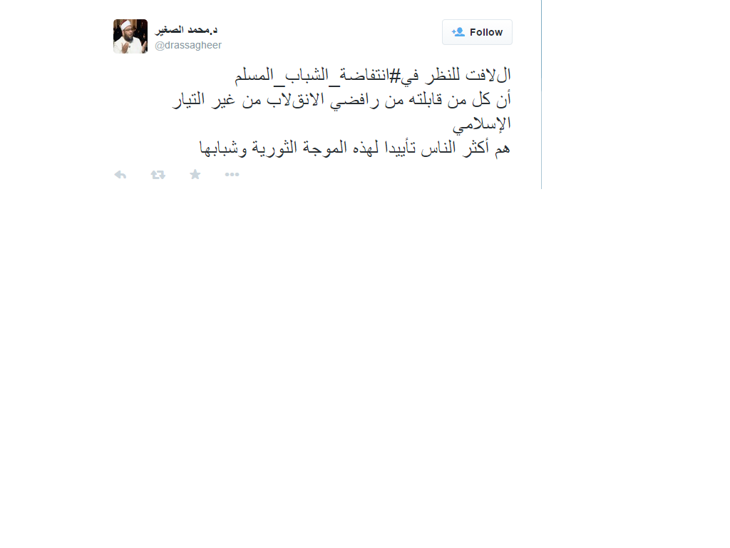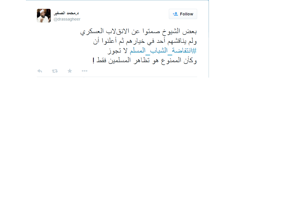 وأضاف الصغير -في تغريدات له عبر موقع التواصل الاجتماعي "تويتر": "بعض الشيوخ صمتوا عن الانقلاب العسكري ولم يناقشهم أحد في خيارهم ثم أعلنوا أن انتفاضة الشباب المسلم، ﻻ تجوز وكأن الممنوع هو تظاهر المسلمين فقط".
