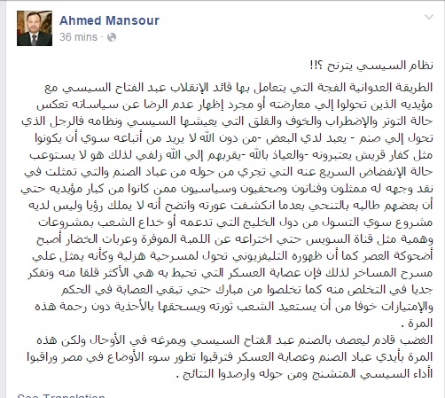 وقال منصور في تدوينة عبر صفحته على موقع التواصل الاجتماعي "فيس بوك": إن "الغضب قادم ليعصف بالصنم عبدالفتاح السيسي، ويمرغه في الأوحال، ولكن هذه المرة بأيدي عباد الصنم، وعصابة العسكر فترقبوا تطور سوء الأوضاع في مصر، وراقبوا أداء السيسي المتشنج، ومن حوله وارصدوا النتائج".