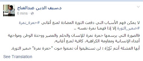 وأضاف أستاذ العلوم السياسية: "أيها الفشلة أنتم نَكِرَة؛ لن تستطيعوا أن تمنعوا صوت "حمزة نمرة" ضمير الثورة".
