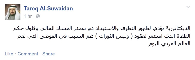 وقال السويدان في تدوينة عبر صفحته على موقع التواصل الاجتماعي "فيس بوك": "الديكتاتورية تؤدي لظهور التطرّف، والاستبداد هو مصدر الفساد المالي، وفلول حكم الطغاة الذي استمر لعقود (وليس الثورات) هم السبب في الفوضى التي تعم العالم العربي اليوم".