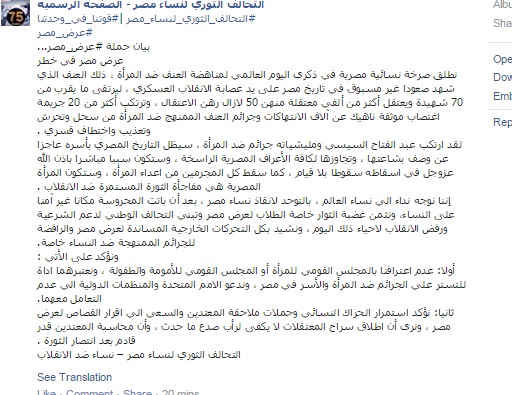وتابع البيان: "إننا نوجه نداءً إلى نساء العالم، بالتوحد لإنقاذ نساء مصر، بعد أن باتت المحروسة مكانًا غير آمنا على النساء، ونثمن غضبة الثوار خاصة الطلاب لعرض مصر وتبني التحالف الوطني لدعم الشرعية ورفض الانقلاب لإحياء ذلك اليوم، ونشيد بكل التحركات الخارجية المساندة لعرض مصر، والرافضة للجرائم الممنهجة ضد النساء خاصة".