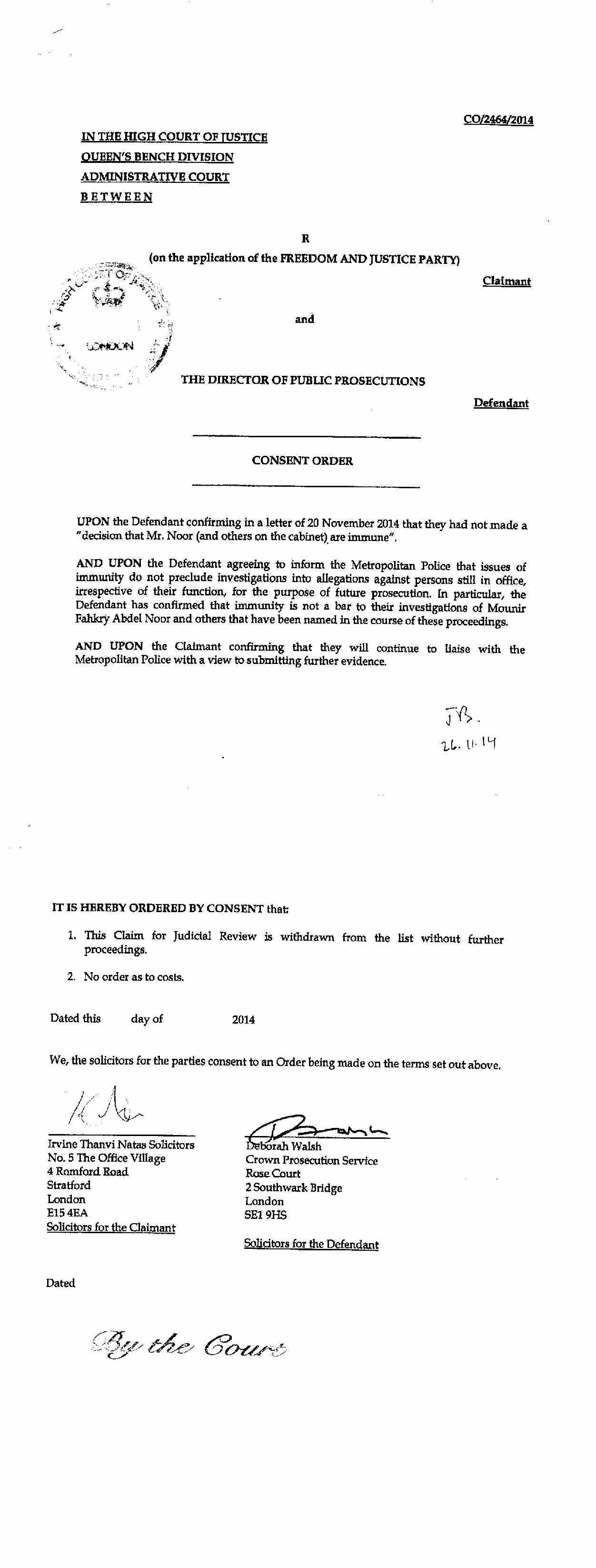 وجاءت موافقة دائرة الادعاء العام خلال إجراءات مراجعة قضائية تم التقدم بها نيابة عن حزب الحرية والعدالة المصري لدى المحكمة العليا في لندن. وترأس الفريق القانوني المدير السابق لدائرة الادعاء المحامي اللورد كين مكدونالد واشتمل على عضوية كل من المحامي رودني ديكسون والمحامي طيب علي والمحامي رافي نايك.