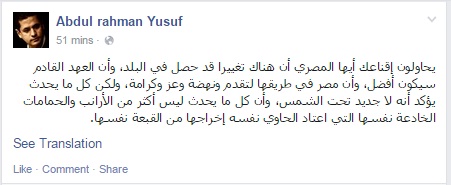 وقال يوسف في تدوينة عبر صفحته على موقع التواصل الاجتماعي "فيس بوك": "يحاولون إقناعك أيها المصري أن هناك تغييرًا قد حصل في البلد، وأن العهد القادم سيكون أفضل، وأن مصر في طريقها لتقدم، ونهضة، وعز، وكرامة".
