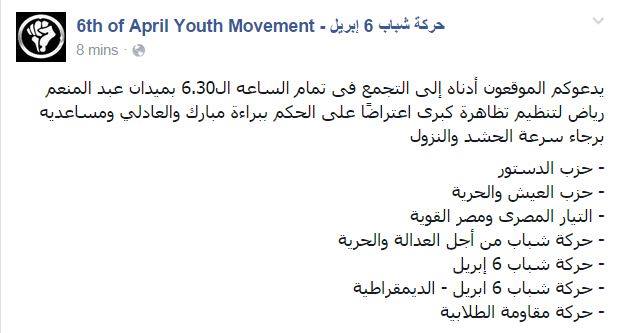 دعت حركة شباب 6 إبريل للحشد للتظاهر في تمام الـ6.30 بميدان عبد المنعم رياض، وذلك اعتراضًا على الحكم ببراءة مبارك والعادلي ومساعديه.
