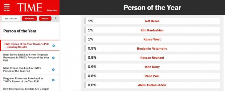 وفقاً للمؤشرات الأولية التي نشرت على الموقع الاليكتروني للمجلة على الانترنت اليوم الأحد أن رئيس الوزراء الهندي ناريندرا مودي تبوأ صدارة الاستفتاء بنسبة 16.2% ، ثم جاء متظاهرو ضاحية فيرجسون الأمريكية التي شهدت مقتل شاب أسود أعزل على يد ضابط شرطة في المركز الثاني بنسبة 9,2 %.