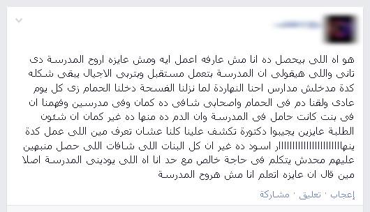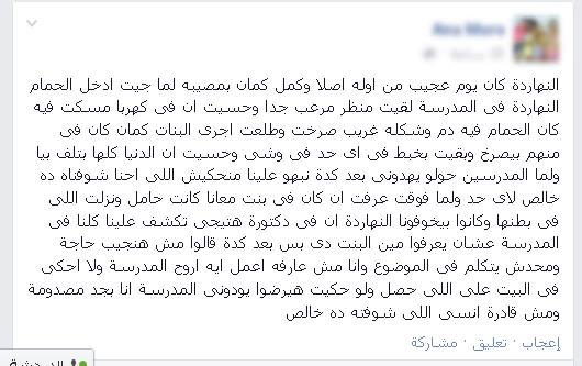 وأضافت فتاه أخرى: "النهاردة كان يوم عجيب من أوله أصلًا، وكمل كمان بمصيبة، لما جيت أدخل الحمام النهاردة في المدرسة لقيت منظر مرعب جدًا، وحسيت إن فى كهربا مسكت فيا، كان الحمام فيه دم وشكله غريب صرخت وطلعت أجري، البنات كمان كان في منهم بيصرخ وبقيت بخبط فى أي حد فى وشي، وحسيت إن الدنيا كلها بتلف بيا، والمدرسين حاولوا يهدوني، بعد كدة نبهوا علينا منحكيش اللي احنا شوفناه ده خالص لأي حد، ولما فوقت عرفت إن كان فى بنت معانا كانت حامل ونزلت اللي فى بطنها".