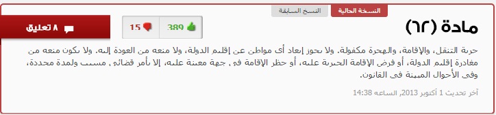 "حرية التنقل، والإقامة، والهجرة مكفولة. ولا يجوز إبعاد أى مواطن عن إقليم الدولة، ولا منعه من العودة إليه. ولا يكون منعه من مغادرة إقليم الدولة، أو فرض الإقامة الجبرية عليه، أو حظر الإقامة فى جهة معينة عليه، إلا بأمر قضائي مسبب ولمدة محددة، وفى الأحوال المبينة فى القانون"..