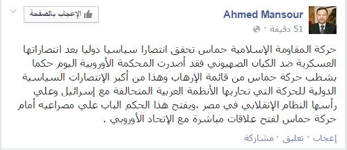وأضاف منصور في تدوينة له عبر "فيس بوك" أن "حركة المقاومة الإسلامية حماس تحقق انتصارا سياسيا دوليا بعد انتصاراتها العسكرية ضد الكيان الصهيوني فقد أصدرت المحكمة الأوروبية اليوم حكما بشطب حركة حماس من قائمة الإرهاب وهذا من أكبر الإنتصارات السياسية الدولية للحركة التي تحاربها الأنظمة العربية المتحالفة مع إسرائيل وعلي رأسها النظام الإنقلابي في مصر ،ويفتح هذا الحكم الباب علي مصراعيه أمام حركة حماس لفتح علاقات مباشرة مع الإتحاد الأوروبي ".