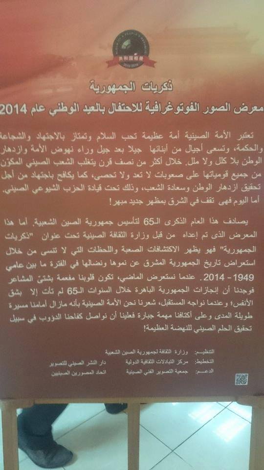 كما عرض عدد من الصور الفوتوغرافية والتي تبرز الإنجازات الصينية في كافة المجالات السياسية والرياضية والعلمية والثقافية، بالإضافة إلى صور توضح بداية الاحتفال بالعيد الوطني للصين.