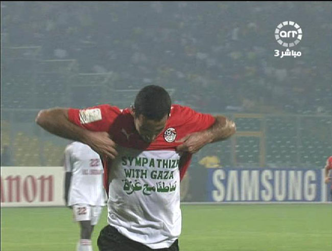عندما رفع اللاعب محمد أبو تريكة نجم الأهلي السابق ومنتخب مصر عبارة "تعاطفًا مع غزة" أثناء الحرب الصهيونية على قطاع غزة عام 2008 لم يفكر وقتها في العقوبة التي ستصدر بحقه ، واكتفى حكم المباراة بإنذاره ومن ثم هدد الاتحاد الأفريقي بإيقافه إلا أن قرارًا لم يصدر بهذا الأمر.