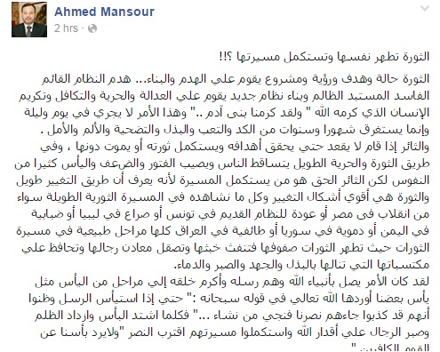 وكتب "منصور" خلال تدوينة له عبر صفحته على موقع" فيس بوك":" ثورة تقوم على هدم النظام القائم الفاسد المستبد الظالم وبناء نظام جديد، يقوم علي العدالة والحرية والتكافل وتكريم الإنسان الذي كرمه الله " ولقد كرمنا بنى آدم"، وهذا الأمر لا يجري في يوٍم وليلة وإنما يستغرق شهورًا وسنوات من الكد والتعب والبذل والتضحية والألم والأمل".