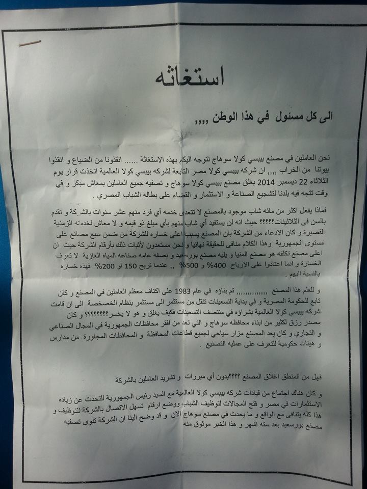 وكان مفاد الرسالة: "نحن العاملون في مصنع بيبسي كولا سوهاج نتوجه اليكم بهذه الاستغاثة، انقذونا من الضياع و انقذوا بيوتنا من الخراب فشركه بيبسي كولا مصر التابعة لشركه بيبسي كولا العالمية اتخذت قرارًا يوم الثلاثاء 22 ديسمبر بغلق مصنع بيبسي كولا سوهاج وتصفية جميع العاملين بمعاش مبكر و في وقت تتجه فيه بلدنا لتشجيع الصناعة والاستثمار والقضاء على بطالة الشباب المصري".