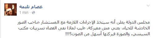 قال الداعية الإسلامي "عصام تليمة" أن مجلس الدولة أعلن أنه سيتخذ الإجراءات اللازمة مع المستشار صاحب الصور الخادشة للحياء، مشيرًا إلي أن هذا يؤكد أن الصور ليست مفبركة.