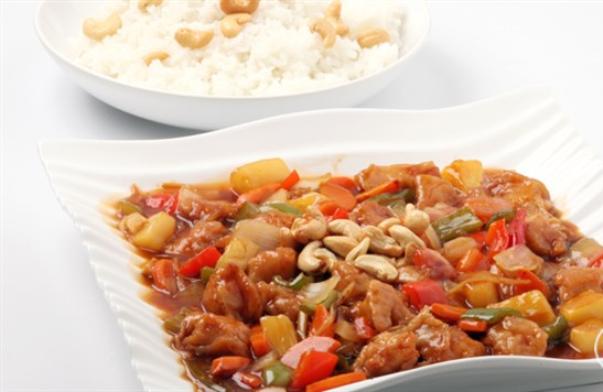 وللغذاء دجاج حار وحلو مع الارز المسلوقوتشمل المكوناتكوبان ارز و3كوب ماء ساخن و½ 1 ملعقة صغيرة ملح و1 ملعقة صغيرة سكر و1ملعقة صغيرة زيت السمسم المحمص