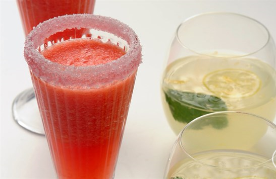 وفي موزع زجاجي خاص للعصير حجم متوسط نضيف عصير الليمون , شراب السكر المبرد , مكعبات الثلج , شرائح الليمون , اوراق النعناع والماء، و