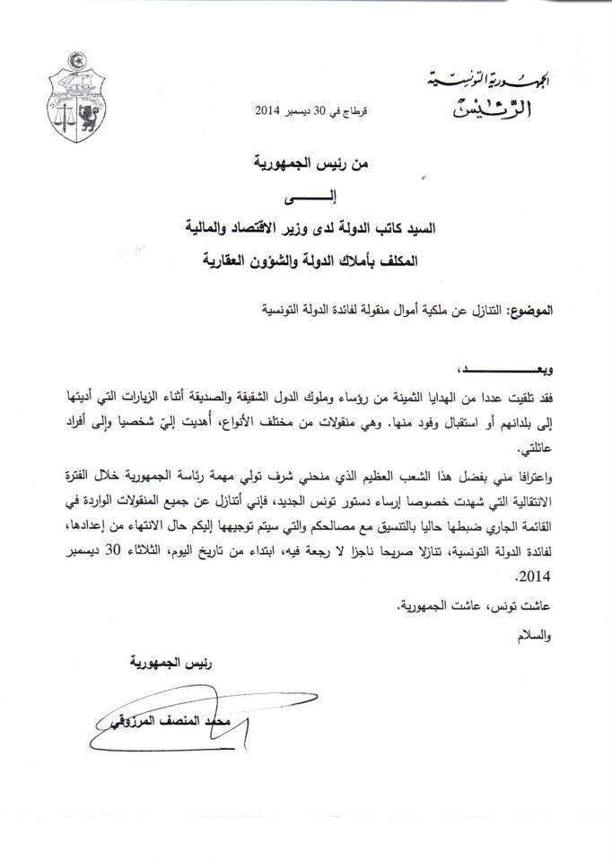 قبل أن يسلم السلطة صباح اليوم بتونس للرئيس الجديد الباجي قايد السبسي، كان أخر قرار وقع عليه الرئيس منصف المرزوقي هو تنازله عن كافة الهدايا والمنقولات التي تلاقها من كافة دول العالم طوال فترة رئاسته لصالح الدولة.