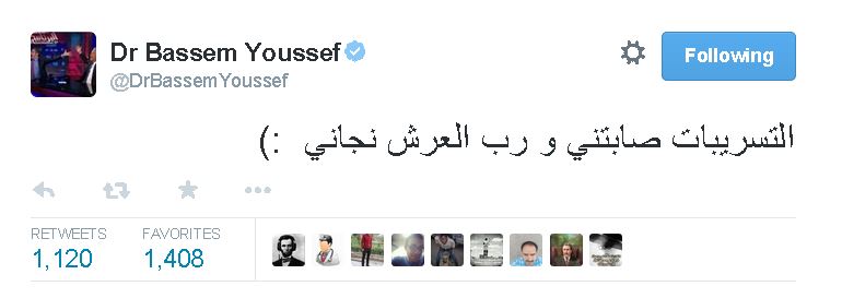 وعلق باسم يوسف على التسريبات مؤكدًا صحتها فقال ساخرًا على حسابه الرسمي على موقع تويتر:"التسريبات صابتني و رب العرش نجاني".