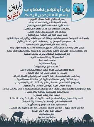 وأردف البيان أن :"العام الماضي اجتمع فيه كل قوى الشر والظلم لتقضى على ثورة مشتته يتصارع أبناؤها فيما بينهم ويتركون عدوهم الحقيقى يدمر ما بقى من ثورتهم".