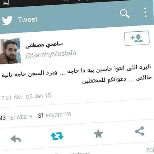 فيما قال المدير التنفيذي لشركة "رصد" سامحي مصطفى عبر تغريدة له عبر حسابه على موقع"تويتر":"البرد اللي انتوا حاسين ده حاجه .. وبرد السجن حاجه تانية خالص.. دعواتكم للمعتقلين".