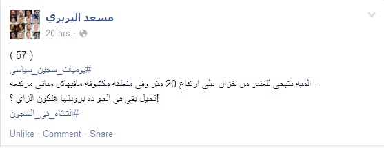 هذا وقد عبر عدد من المعتقلين عن معاناتهم داخل السجون في ظل موجة الصقيع الشديدة التي تمر بها مصر حاليًا، إذ كتب مسعد البربري تدوينة عبر صفحته على موقع"فيس بوك" قال فيها:" الميه بتيجي للعنبر من خزان علي ارتفاع 20 متر وفي منطقه مكشوفه مافيهاش مباني مرتفعه..تخيل بقي في الجو ده برودتها هتكون الزاي ؟!#الشتاء_في_السجون".