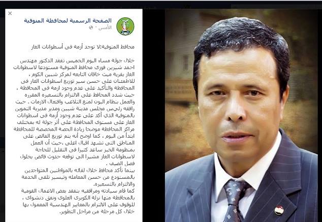 فيما يخرج محافظ المنوفية المعين من قبل حكومة الانقلاب أحمد شيرين فوزي قائلًا:"إن المحافظة لا تحوي أزمة في أسطوانات الغاز"، وذلك بعد زيارة لـمستودع بقرية "ميت خاقان" التابعة لمركز شبين الكوم.