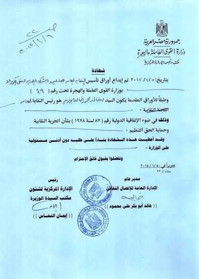 وأكدت "النقابة" في بيان لها اليوم تلقت "رصد" نسخة منه، أنها أودعت أوراقها بديوان عام وزارة القوى العاملة برقم 175/ 2 بتاريخ 5/ 2/ 2012.