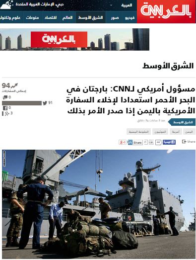 كشفت شبكة cnn الأمريكية إن بارجتين تابعتين للبحرية الأمريكية قد وصلتا إلى مواقعهما الجديدة في البحر الأحمر، استعدادا لإخلاء موظفي السفارة الأمريكية في العاصمة اليمنية، صنعاء، إن صدر الأمر بذلك.