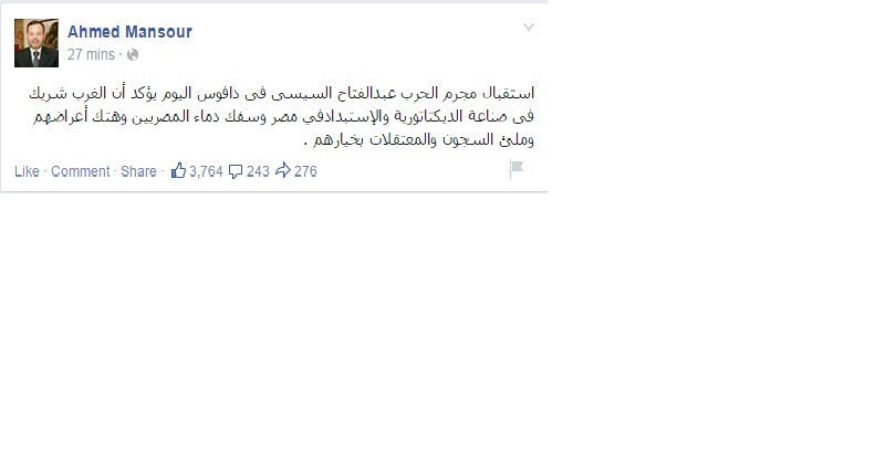قال الإعلامي أحمد منصور ،مقدم أحد البرامج بقناة الجزيرة: "إن استقبال السيسي قائد الانقلاب العسكري اليوم في منتدى دافوس يكشف النقاب عن تورط الغرب في صناعة الاستبداد في مصر".