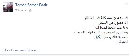 وقال بدر على حسابه الرسمي على قناة "فيس بوك": "في عندي مشكلة في المطار أنا ممنوع من السفر وأنا عند ضابط الجوازات وطالبين تصريح من المخابرات الحربية، حسبنا الله ونعم الوكيل ادعولي انا لسه في المطار ومحطوط في قائمة الممنوعين من السفر وفي مندوبين من المخابرات وضباط الجوزات معي الان".