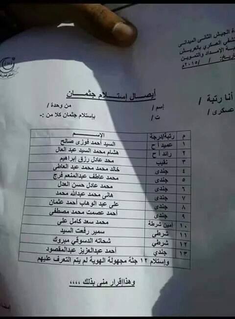 والضباط هم" العميد أركان حرب سيد فوزي " و"النقيب محمد عادل " و" الرائد هشام عبد العال "بالإضافة إلى 9 مجندين.