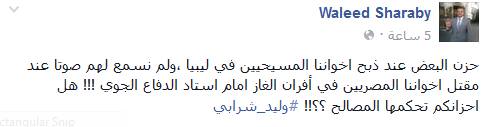 وقال شرابي، في تدوينة له اليوم: حزن البعض عند ذبح إخواننا المسيحيين في ليبيا، ولم نسمع لهم صوتًا عند مقتل إخواننا المصريين في أفران الغاز أمام استاد الدفاع الجوي ، متسائلًا: هل أحزانكم تحكمها المصالح ؟!.