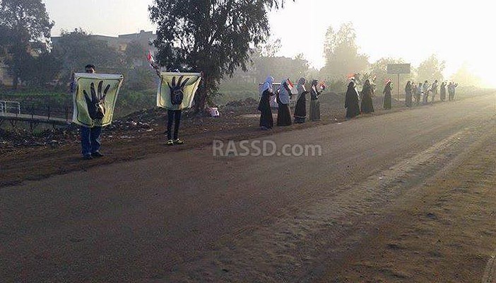 وفي دمياط نظم الأهالي سلسلة بشرية على طريق دمياط– جمصة، أمام قرية أم الرضا، تنديدا بحكم العسكر، واحتجاز الفتيات بسجون داخلية الانقلاب، مؤكدين استمرار الحراك الثوري حتى سقوط الانقلاب والقصاص للشهداء.