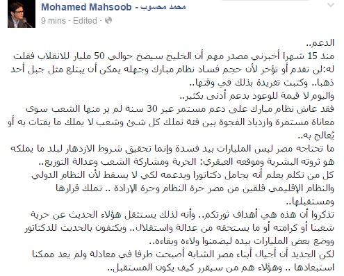 وتابع قائلا: "ما تحتاجه مصر ليس المليارات بيد فسدة، وإنما تحقيق شروط الازدهار لبلد ما يملكه هو ثروته البشرية وموقعه العبقري: الحرية ومشاركة الشعب وعدالة التوزيع.. كل من تكلم يعلم أنه يجامل دكتاتورا، ويدعمه لكي لا يسقط لأن النظام الدولي والنظام الإقليمي قلقين من مصر حرة النظام وحرة الإرادة.. تملك قرارها ومستقبلها".