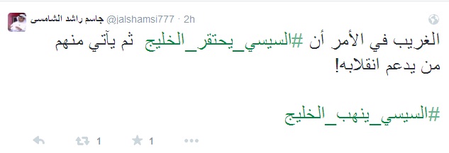 وكتب في تغريدة له عبر حسابه على موقع "تويتر": "الغريب في الأمر أن السيسي يحتقر الخليج  ثم يآتي منهم من يدعم انقلابه!".