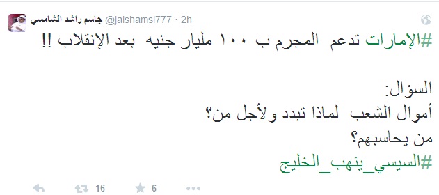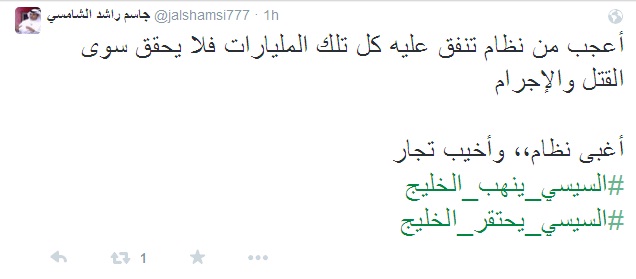 استنكر الكاتب والناشط الإماراتي جاسم راشد الشامسي دعم الخليج لقائد الانقلاب العسكري عبدالفتاح السيسي في المؤتمر الاقتصادي، قائلا: "أعجب من نظام تنفق عليه كل تلك المليارات فلا يحقق سوى القتل والإجرام.. أغبى نظام،، وأخيب تجار".