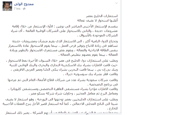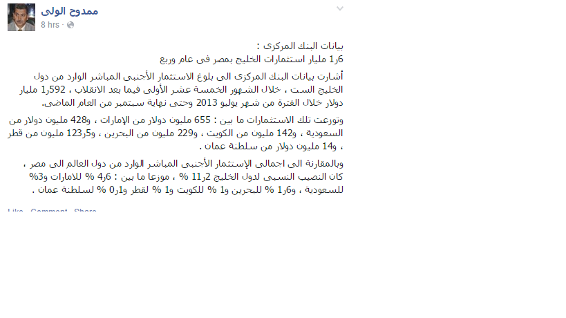 وكان "الولي"، لفت في تدوينةٍ سابقة له، إلى أن بيانات البنك المركزي المصري، أشارت إلى بلوغ الاستثمار الأجنبي المباشر الوارد من دول الخليج، خلال الشهور 15 الأولى فيما بعد انقلاب 30 يوليو 2013؛ 1.592مليار دولار خلال الفترة من شهر يوليو 2013 وحتى نهاية سبتمبر من العام الماضي 2014.