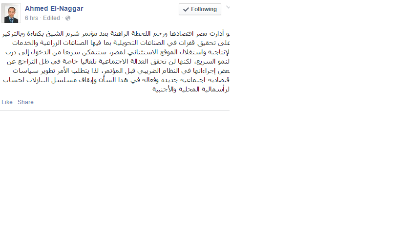 وقال الخبير الاقتصادي ورئيس مجلس إدارة الأهرام، أحمد النجار، عبر صفحته الشخصية على موقع التواصل الاجتماعي "فيس بوك"، إن مصر لن تحقق العدالة الاجتماعية تلقائيا، في ظل التراجع عن بعض إجراءاتها في النظام الضريبي قبل المؤتمر، مبينا أن الأمر  يتطلب تطوير سياسات اقتصادية اجتماعية جديدة وفعالة في هذا الشأن، وإيقاف مسلسل التنازلات لحساب الرأسمالية المحلية والأجنبية.