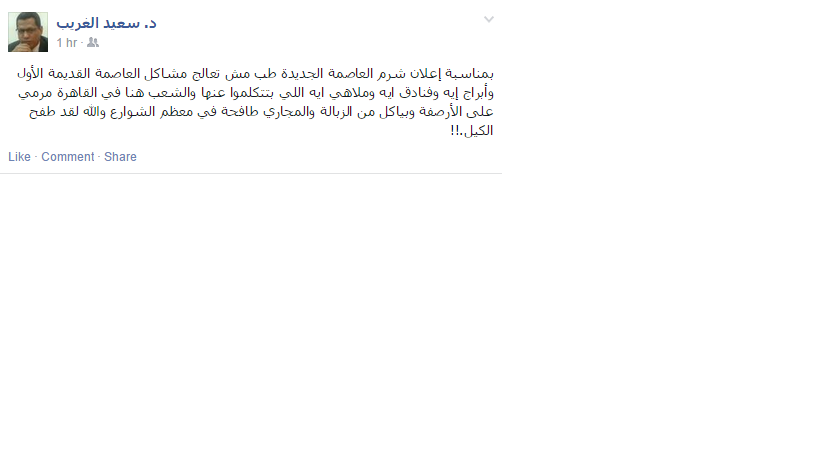 الدكتور سعيد الغريب، أستاذ الصحافة بجامعة القاهرة، علق على مشروع إقامة العاصمة الإدارية الجديدة: "بمناسبة إعلان شرم العاصمة الجديدة طب مش تعالج مشاكل العاصمة القديمة الأول، وأبراج إيه وفنادق إيه وملاهي إيه اللي بتتكلموا عنها، والشعب هنا في القاهرة مرمي على الأرصفة، وبياكل من الزبالة، والمجاري طافحة في معظم الشوارع، والله لقد طفح الكيل!".