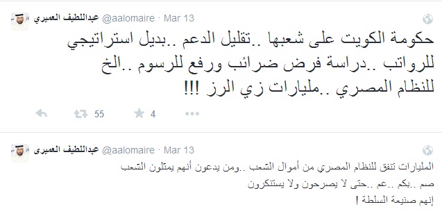 وأضاف في تغريدة ثانية:" حكومة الكويت على شعبها ..تقليل الدعم ..بديل استراتيجي للرواتب ..دراسة فرض ضرائب ورفع للرسوم ..الخ..للنظام المصري ..مليارات زي الرز !".