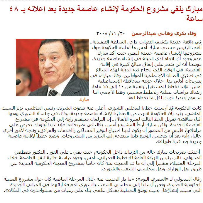 سر إلغاء مبارك لإنشاء عاصمة جديدة قبل ٧ أعوام