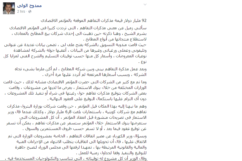 وأضاف الولي عبر صفحته علي موقع التواصل الاجتماعي الفيس بوك: توقيع مذكرات التفاهم غير ملزم علي الإطلاق لهذه الشركات لأنه يعني ببساطة توقيع الشركات علي رؤية عروض الحكومة للاستثمار ولكن توقيعها لا يعني أنها ستنفذ هذه الاستثمارات علي الإطلاق.